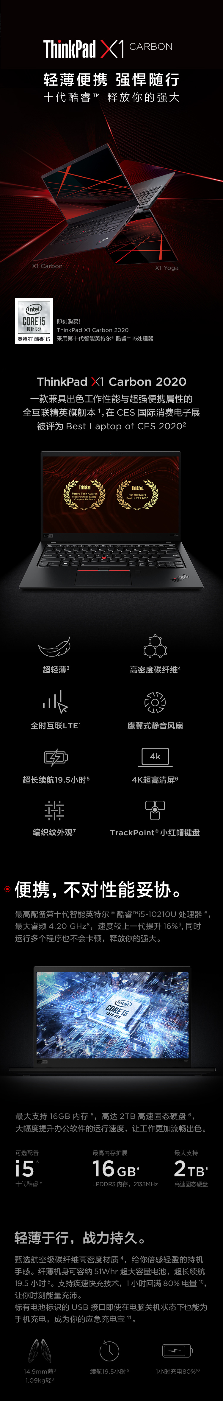 联想ThinkPad X1 Carbon 2020 7FCD 英特尔酷睿i5 14英寸轻薄笔记本电脑 十代i5 16G 512G 4G版 沉浸黑