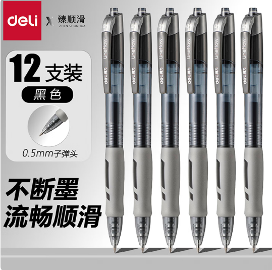 得力/deli S08 书写用笔类用具 0.5mm中性笔 碳素黑色按压式速干圆珠水笔 黑色 12支盒装